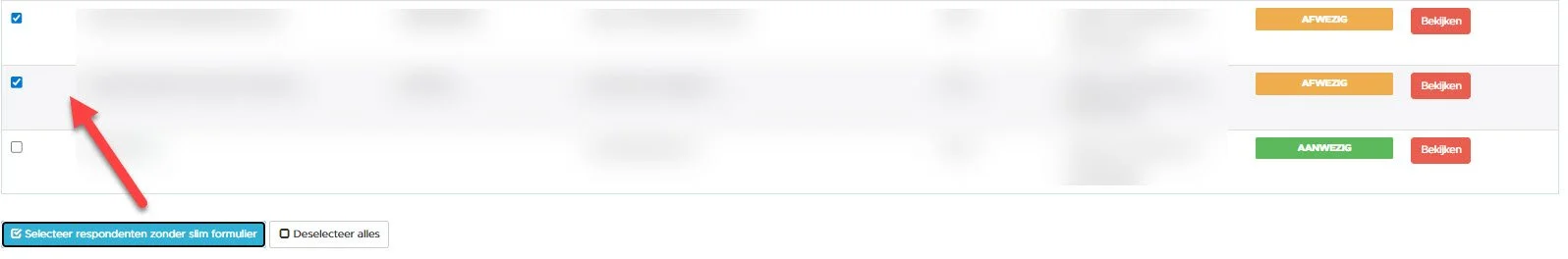 Onderaan de lijst met respondenten staat een button om de respondenten te selecteren die geen formulier hebben. Met deze button worden zij in 1x geselecteerd.