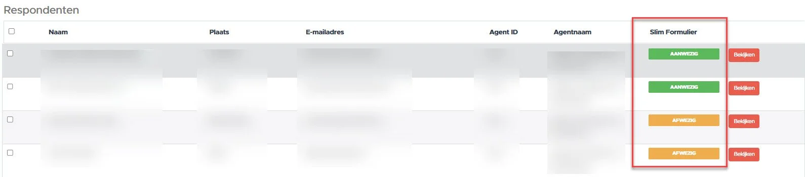 Het kan incidenteel voorkomen dat bij de verzending of export via de respondentengroep, het slimme formulier niet is aangemaakt bij de respondent of meerdere respondenten. Er zal dan duidelijk een verschil te zien zijn bij het status overzicht tussen het aantal aanwezige respondenten en het aantal verzonden formulieren. Als het aantal verzonden formulieren lager is dan het aantal respondenten, check dan of er een aantal respondenten zijn, waar in de kolom ‘Slim formulier’ op Afwezig staat. Is dit het geval, dan kan het slimme formulier alsnog gemaild worden.