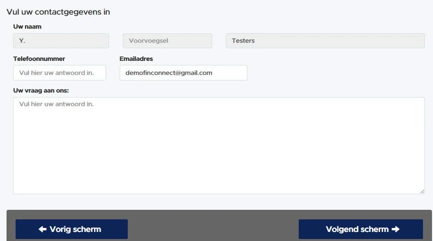 Als de klant via de button het contactformulier opent, worden respondentdata meegenomen en vooraf ingevuld (indien in deze vragen vooraf invullen ook is ingericht). Zo hoeft de klant geen gegevens opnieuw op te geven. Of u deze gegevens readonly of muteerbaar laat zijn, dat kan u zelf bij de vraaginrichting bepalen.