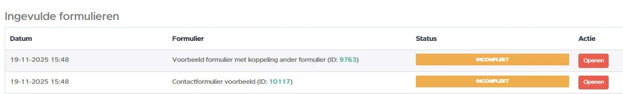 Bij de respondent wordt de status van het 1e formulier en de gekoppelde formulier(en) bijgehouden. Opent de klant meerdere keren het gekoppelde formulier via de button in het 1e formulier, dan wordt dit ook meerdere keren bij de respondent getoond.
