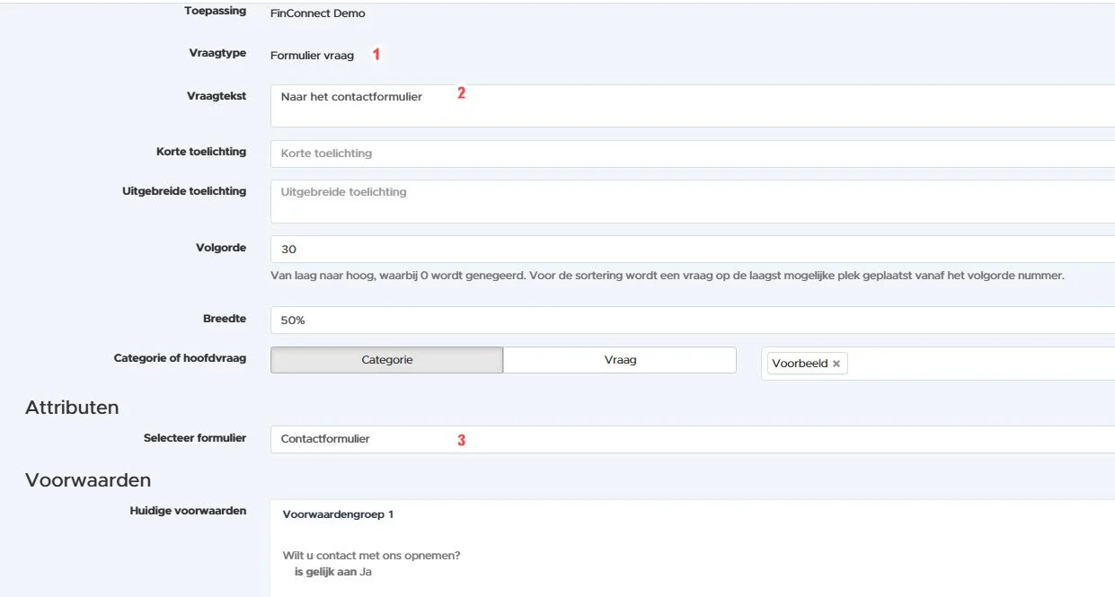 Vul de vraagtekst in als toelichting op de button (2) en kies het juiste formulier (3). U heeft dus alleen de keuze uit de formulieren die op hetzelfde niveau staan, als dit aangemaakte formulier.
